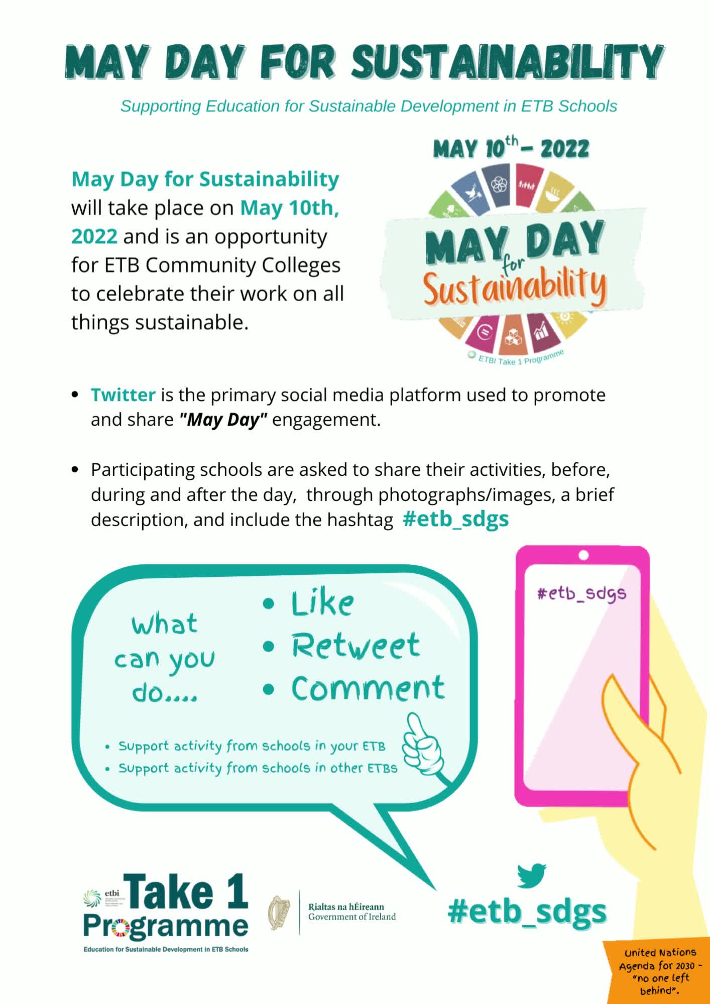 The Take 1 Programme approach embeds Education for Sustainable Development (ESD) in learning and teaching in Irish second level schools as part of a whole-school curriculum. The Take 1 Programme training approach maps theUnited Nations Sustainable Development Goals (SDGs) to the learning outcomes of subject specifications ensuring 'every student, in every subject and every classroom' has an opportunity to experience transformative ESD learning. The Take 1 Programme reflects the domains and dimensions of Looking at Our School 2022and is reflective of DEIS and SSE Whole-School planning.