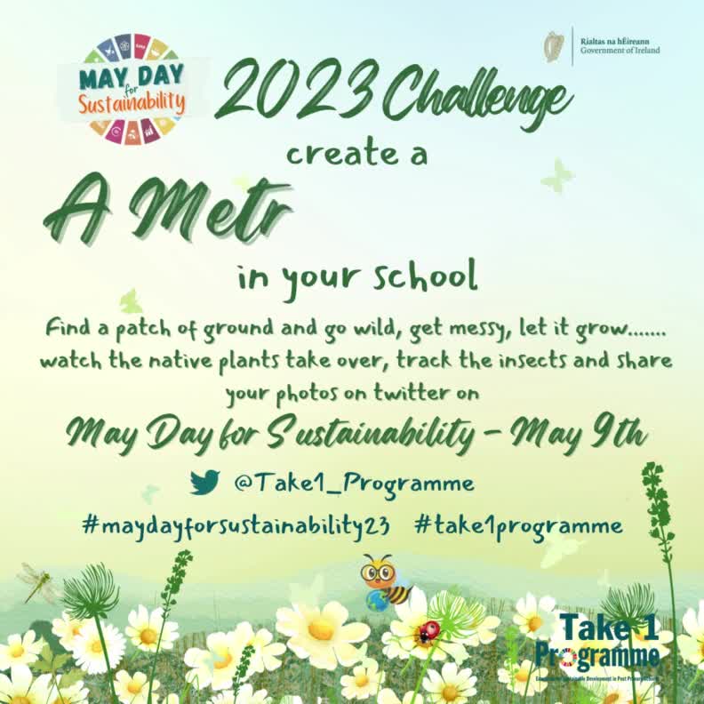Create a Metre of meadow in your school community! Find a patch of ground and let the grass grow wild - watch the birds, bees and plants that appear. Share on social media and go green for May Day for Sustainability #take1mayday